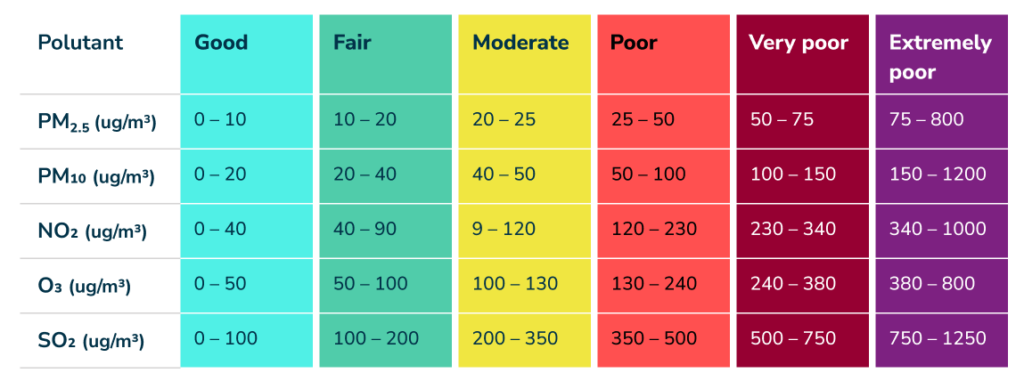 The colour scheme is provided to give information on the status of the air quality at each station.