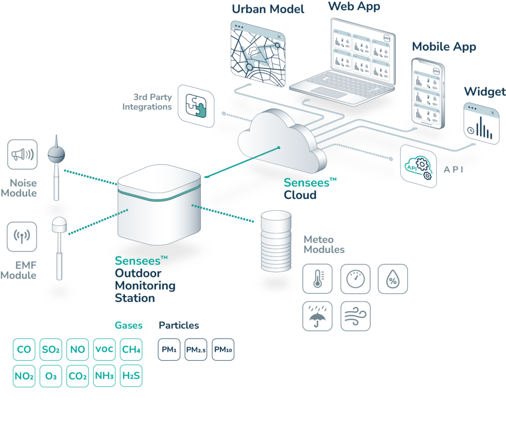 Sensees Outdoor Sustav za praćenje kvalitete zraka i okolišnih parametara: Pruža podatke o plinovima, zagađivačima, meteorološkim uvjetima, kao i o razinama buke i elektromagnetskih polja (EMF) u stvarnom vremenu, što omogućuje donošenje informiranih odluka za zaštitu radnika i optimizaciju industrijskih procesa.