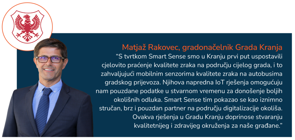U Kranju, Sensees mobilne stanice mjere temperaturu, vlagu i tlak zraka, ključne onečišćujuće plinove NO₂, NO, CO i CO₂ kao lebdeće čestice PM₁₀, PM₂.₅ i PM₁.