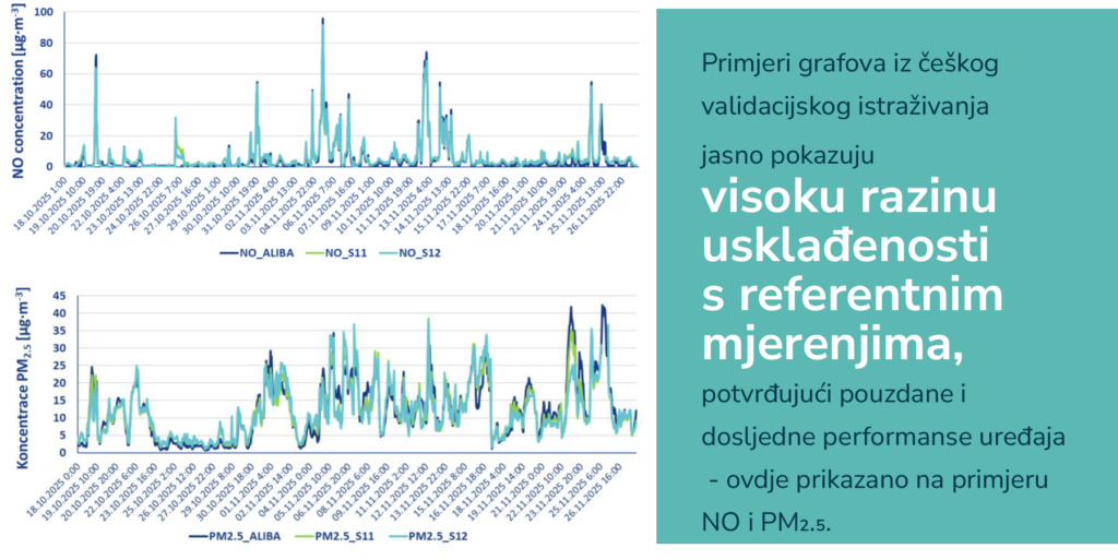 Rezultati su pokazali visok stupanj podudarnosti, pri čemu je koeficijent determinacije (R²) za određene polutante dosezao i do 0,99, što potvrđuje izuzetno slaganje s referentnim mjerenjima. To je dodatno potvrđeno jednoznamenkastom međusenzorskom varijabilnošću na osam istovremeno postavljenih jedinica.
